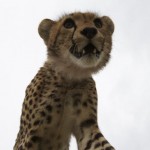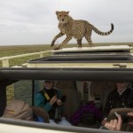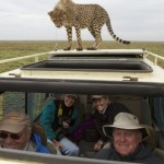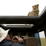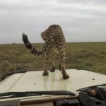 The young cheetah moved to the back of the vehicle and then jumped onto the spare wheels at the back, and then onto the roof of the vehicle. I slowly put my head through the top hatch and took some pictures of him as he began to chew the rubber fastening on the roof hatch. He peeped into the vehicle periodically as if to make sure that we were watching him.